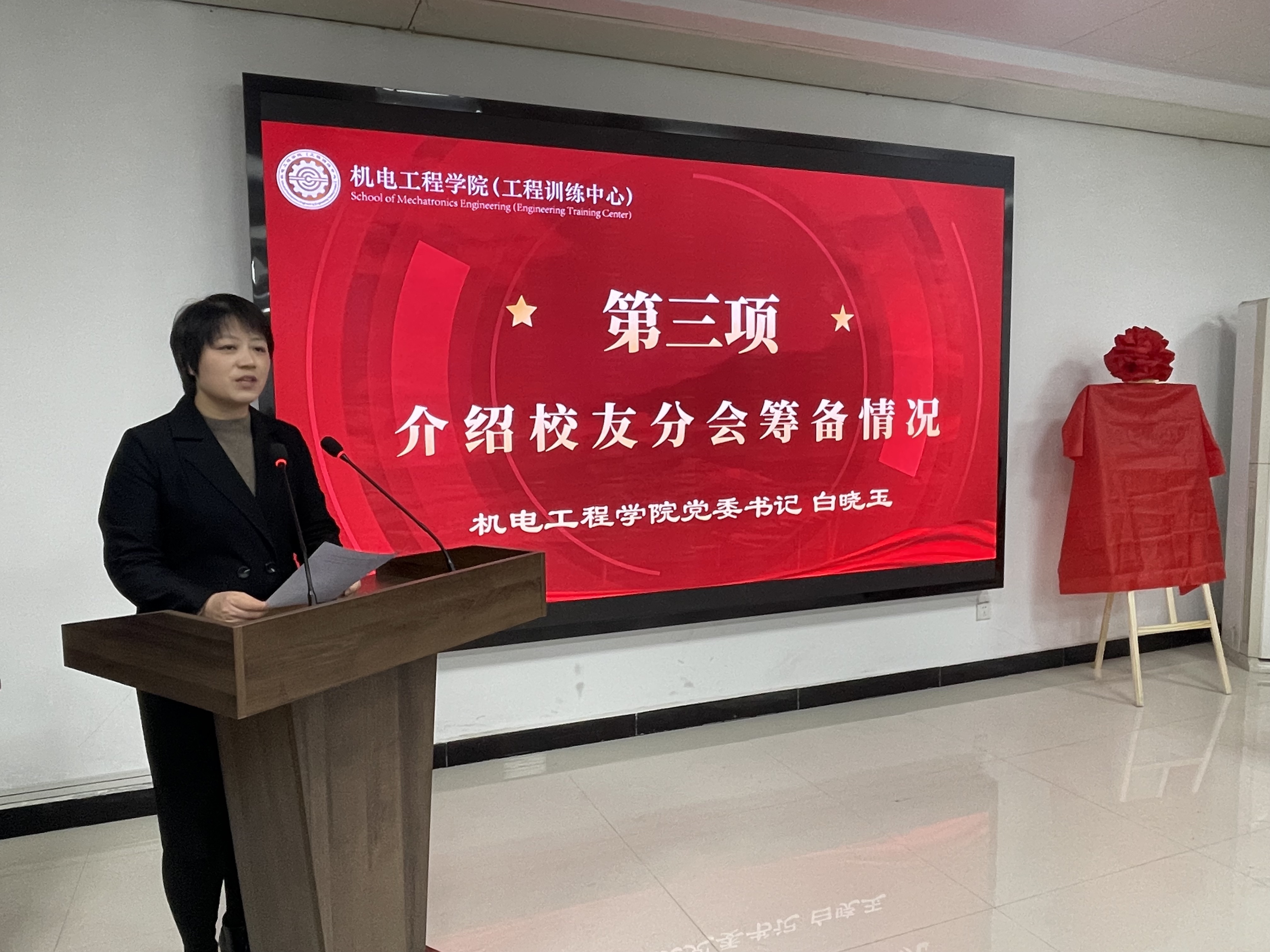 机电工程学院党委书记白晓玉介绍校友分会的筹备情况,她对来自各地的校友表示热烈欢迎,并介绍了学院近年来在人才培养、科学研究、社会服务等方面取得的显著成绩。她表示,校友是学院最宝贵的财富,校友分会的成立将进一步促进学院与校友间的联系,共同推动学院和校友事业的发展。