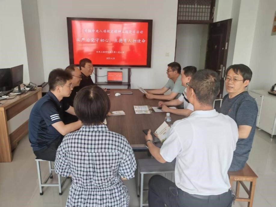 为深入贯彻中央八项规定精神学习教育,全面加强党员作风建设,切实把纪律规矩挺在前面,2025年4月18日,机电工程学院教工第二党支部在工训楼532室开展了“贯彻中央八项规定精神——全面从严治党守初心,立德树人担使命”主题党日活动。本次活动聚焦纪律规矩、作风建设和育人使命,组织党员集中学习中央八项规定精神实质,强化廉洁自律意识。