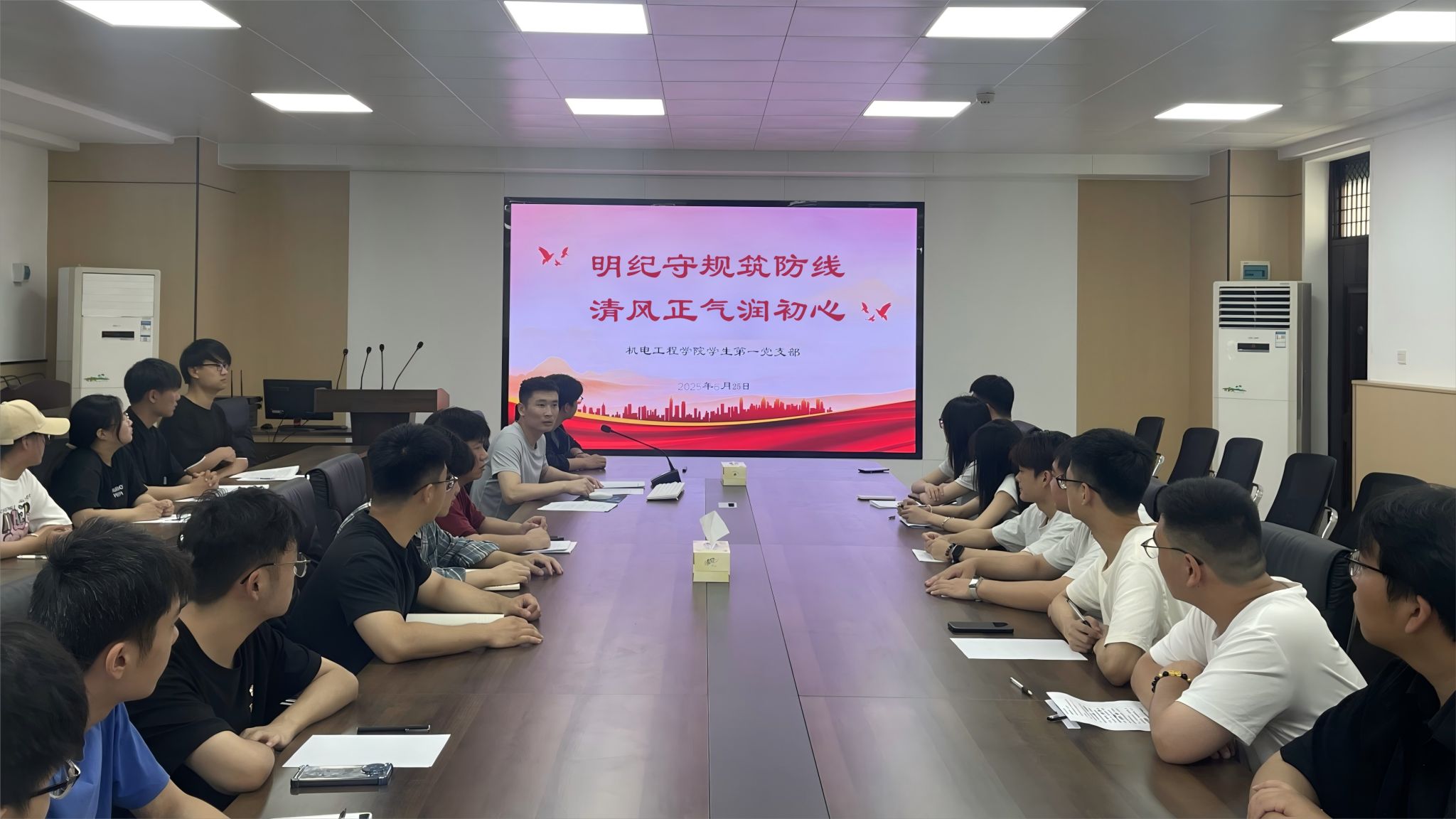 为深入学习贯彻中央八项规定精神,持续巩固拓展学习贯彻习近平新时代中国特色社会主义思想主题教育和党纪学习教育成果,2025年6月25日,机电工程学院学生第一党支部在544会议室组织开展了“明纪守规筑防线,清风正气润初心”主题党日活动。