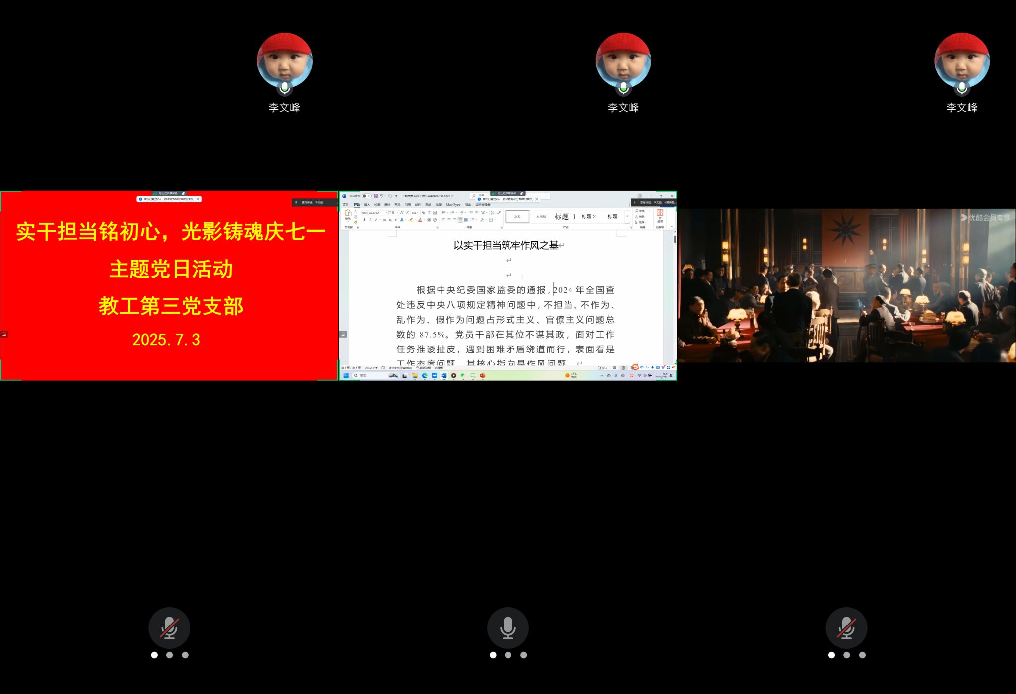 为深入学习贯彻习近平新时代中国特色社会主义思想和中央八项规定精神,切实增强党员党性修养和宗旨意识,2025年7月3日,机电工程学院教工第三党支部组织开展“实干担当铭初心,光影铸魂庆七一”主题党日活动。活动通过专题党课与红色观影相结合的形式,进一步凝聚奋进力量、激发担当精神。