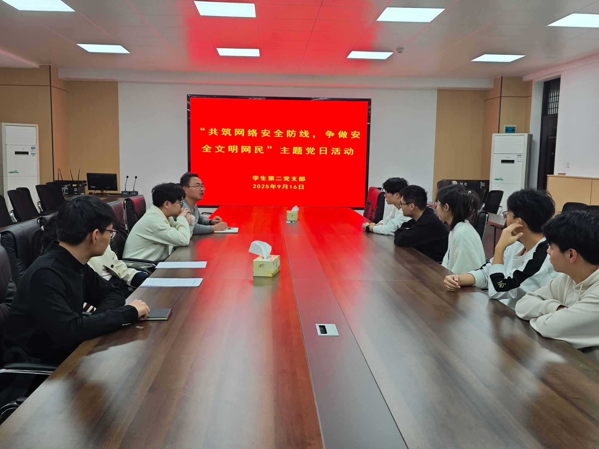 为积极响应国家网络安全宣传周号召,强化党员网络安全意识与风险防范能力,机电工程学院学生第二党支部于2025年9月16日在会议室544组织开展以“共筑网络安全防线,争做安全文明网民”为主题的党日活动。活动由支部书记梁满营同志主持,活动通过“观、学、研”多元化形式,全方位筑牢党员网络安全思想根基,推动网络安全理念深度内化。
