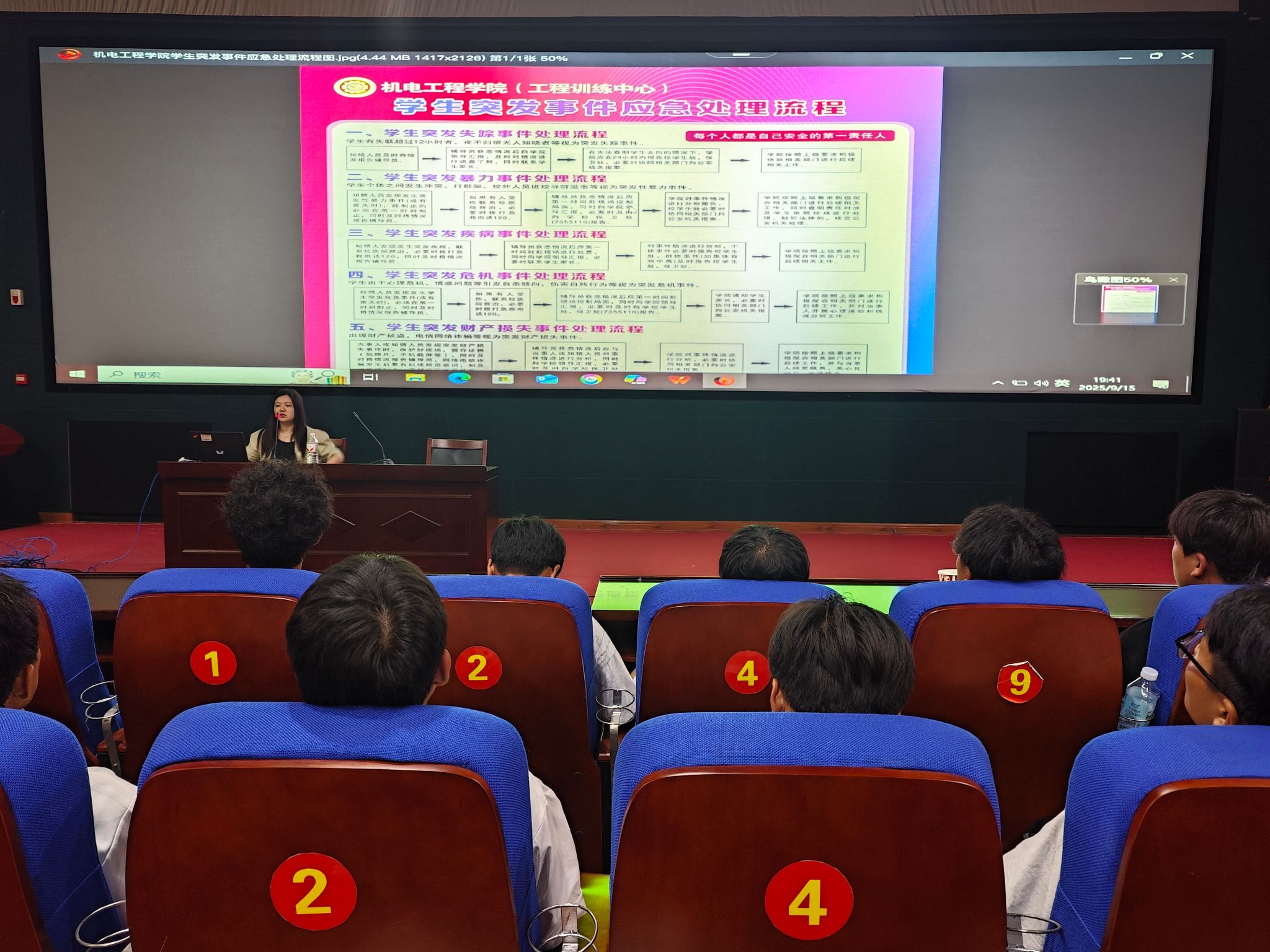 余璐强调,大学不仅是学习知识、追逐梦想的地方,更是大家共同生活、成长的家园。一个安全、和谐的校园环境离不开每位同学的共同努力。她从宿舍用电安全、消防安全、网络安全、交通安全、人际交往安全等多个方面进行讲解,内容详实,既有政策层面的解读,又有贴近学生生活的提醒,语言通俗易懂,案例生动鲜活。现场氛围热烈,同学们认真聆听,积极互动,不少新生表示收获颇丰。