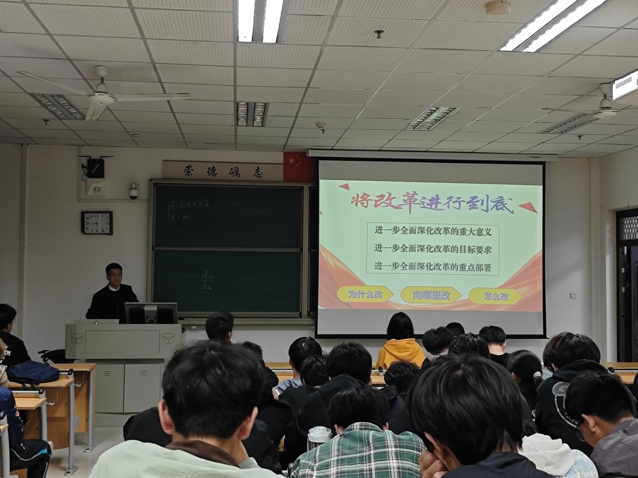 接着,菅老师向同学们阐述了进一步全面深化改革的措施,他强调,要注重发挥经济体制改革牵引作用,一心一意谋发展;注重构建支持全面创新体制机制,鼓励大家努力奋斗;注重全面改革,推动各领域协同共进;注重统筹国家安全,确保国家的稳定和安全。