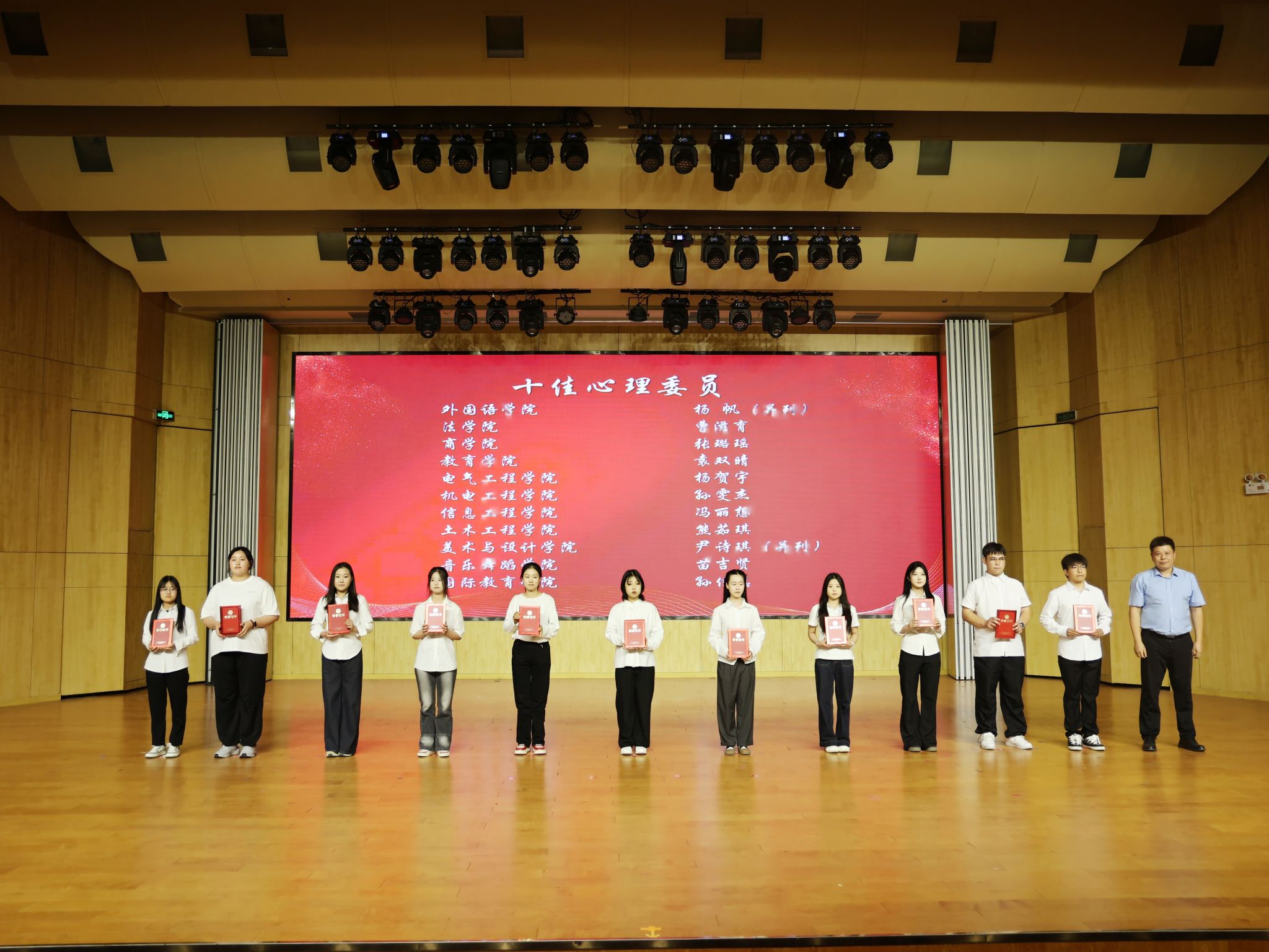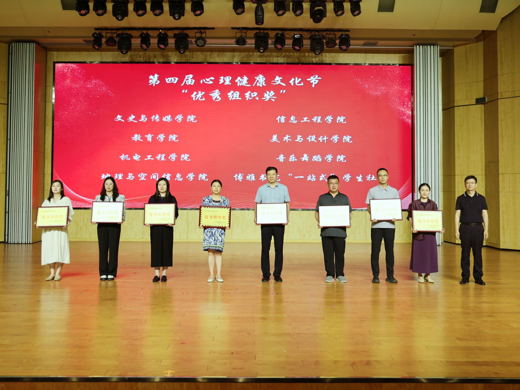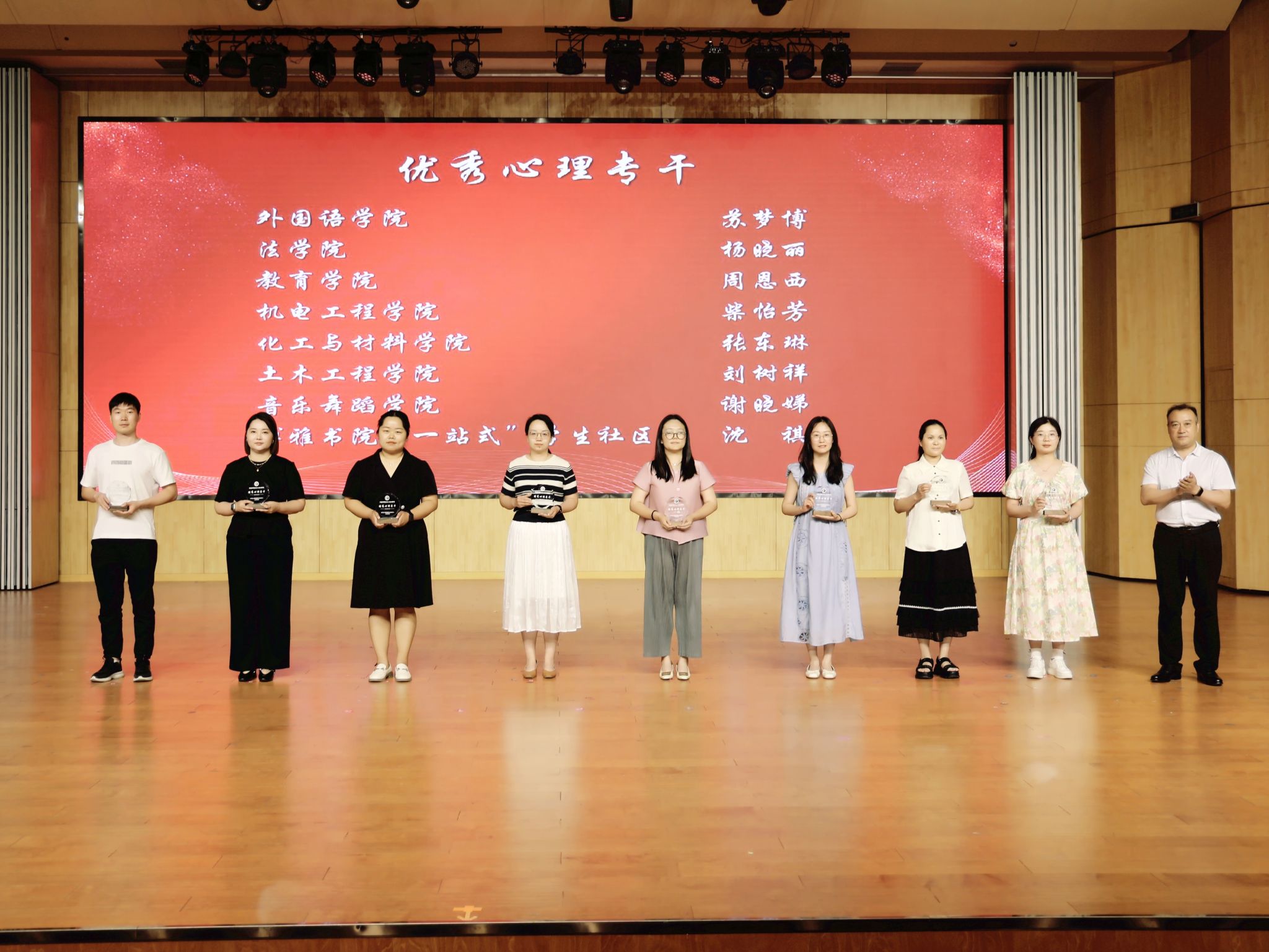 5月29日下午,许昌学院“育心赋能 乐享青春”第四届心理健康文化节闭幕式暨颁奖仪式在艺术楼音乐厅举行。本届文化节以多元形式普及心理健康知识,营造了关爱心灵、积极向上的校园氛围。我院师生积极参与、创新实践,凭借扎实的活动组织与突出的工作成效,荣获“优秀组织奖”,柴怡芳老师获评“优秀心理专干”,23级机电本二班孙雯杰同学荣获“十佳心理委员”称号。