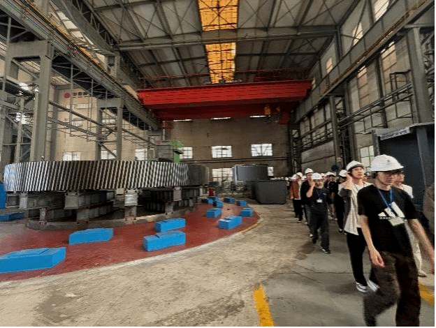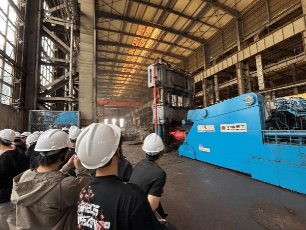 在中信重工国家级企业技术中心,同学们直观感受从产品研发、模拟验证到试验检测的一体化创新体系,充分体会企业在高端装备领域的自主研发能力与技术突破。在重型机加车间,同学们近距离观摩超大型数控立车、数控龙门铣等“国之重器”设备,亲眼见证超大尺寸关键零部件的精密切削、精细打磨等加工过程,深刻认识到微米级精度控制对重型装备性能的重要意义。在18500t油压机锻造车间,同学们现场观看万吨级油压机高效完成大型锻件的成型锻造,亲身感受重型装备制造的磅礴气势与硬核实力,深刻领会追求卓越的新时代工匠精神。