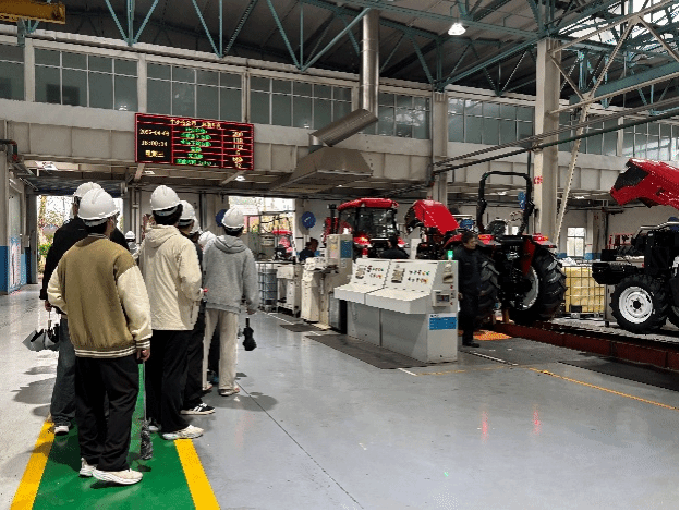 在福莱格车身分厂生产一线,同学们详细观摩了农机覆盖件的冲压成型、组合焊接、表面涂装及总成装配等核心工序。通过现场观摩自动化生产设备与精度检测流程,深刻认识零部件成型质量控制、表面工艺处理及智能制造技术在实际生产中的应用,完善了对机械制造全流程的理解。进入中小拖厂总装生产线,同学们全程观摩中小型轮式拖拉机的装配作业流程,重点学习发动机装配、液压系统调校、整机性能检测等关键环节。大家直观感受自动化输送线与人工作业高效协同的生产模式,清晰掌握农机装备从零散部件到完整整机的组装过程,对现代农机制造流程有了全面认识。
