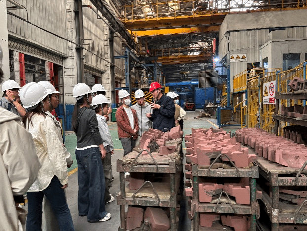 在中国一拖铸造分厂,同学们在指导师傅带领下认真观摩了砂型铸造的制芯、造型、金属浇注、铸件清理等完整工艺链条。通过现场观摩德国KW静压造型线、冷芯盒制芯中心等先进装备运行情况,真切体会传统铸造工艺与现代智能装备深度融合的升级成果,对铸件生产工艺与质量保障体系有了直观把握。在汇德工装生产现场,企业指导师傅向同学们详细地介绍了液压夹具、焊接夹具、精密检测仪器及智能自动化装备核心工装。大家近距离观察多品类、小批量工装夹具的结构特点与制作工艺,深入理解各类刀具、检具、量具在精密加工中的适配逻辑与工作原理,进一步夯实了机械制造基础认知。